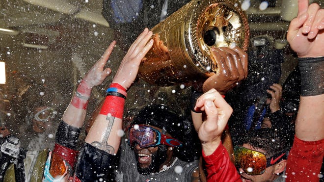 David Ortiz drinking champagne after the Red Sox won the World Series.
